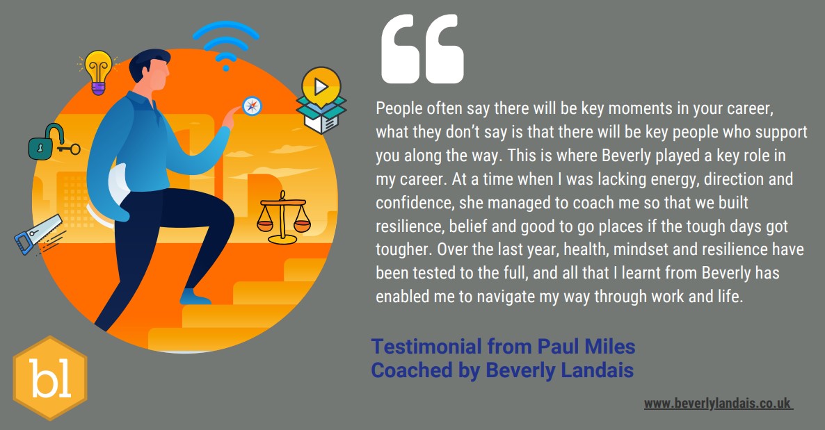 Hello there, I’m Beverly Landais, a certified coach, positive psychology practitioner, and certified psychometric test user with extensive business experience. I’m based in Kent and enjoy working with clients from diverse backgrounds and age groups, from those in their twenties to over sixty.
